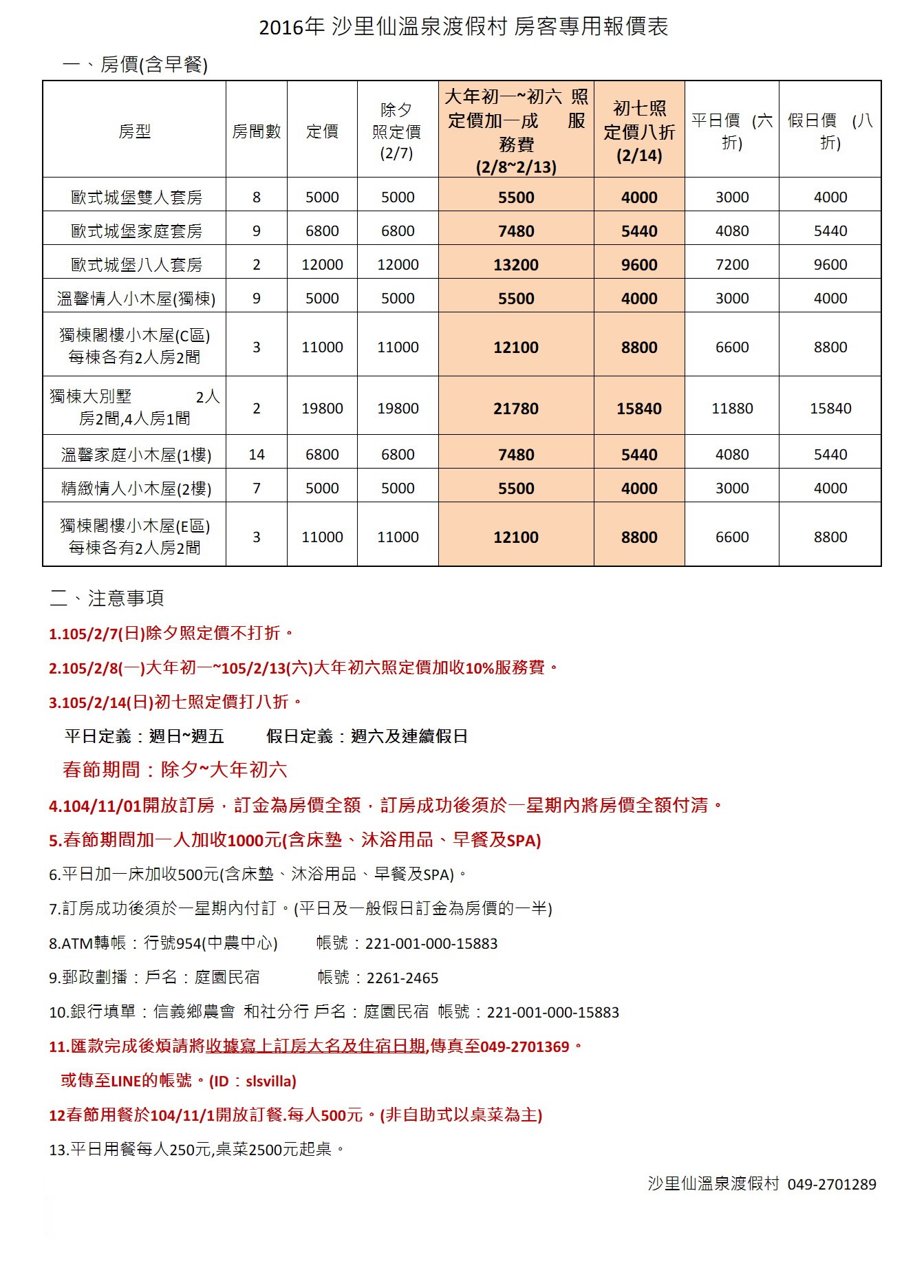 105年(2016)農曆春節訂房, 已於104年11月1日早上七點整開放, 皆以電話訂房,恕不接受電話以外方式訂房, 2016房價以及訂房相關規定請參考以下房價表, 如有未載明部分,以本渡假村公告為主, 請有訂房需求的朋友,把握訂房開放時間,以免向隅!